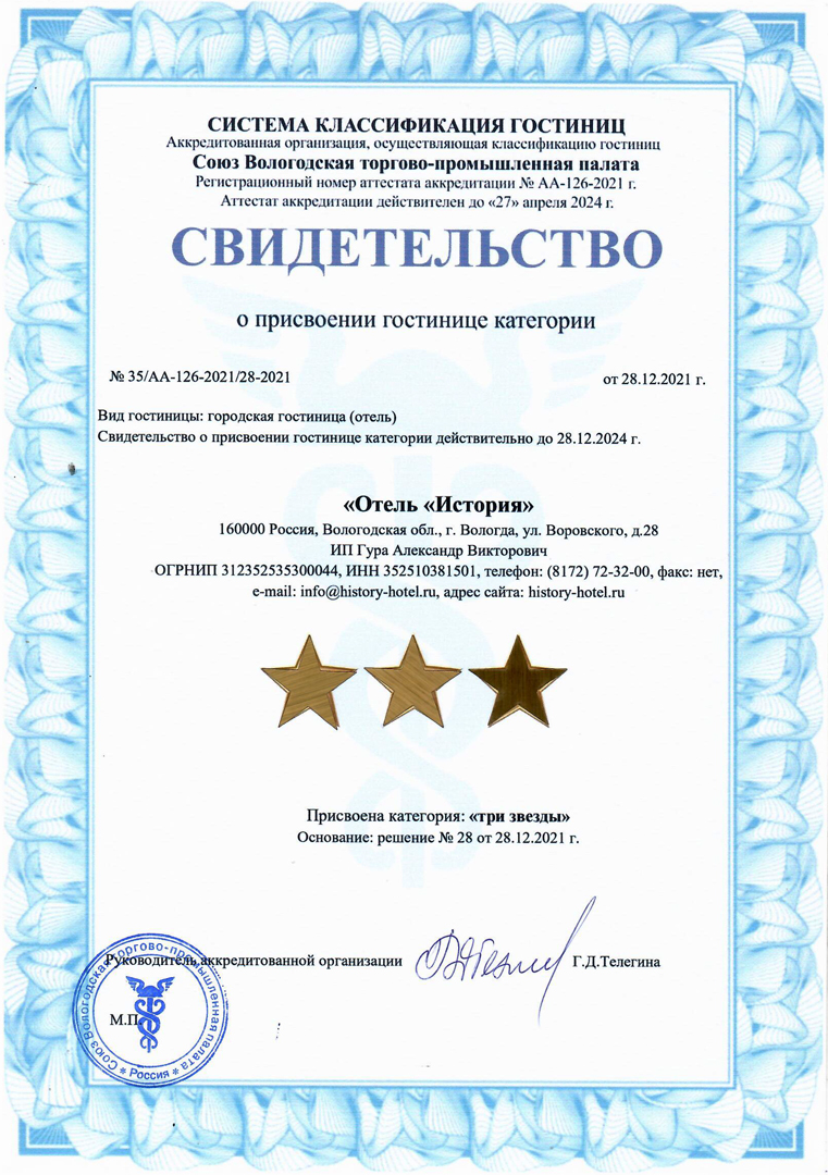 Свидетельство о присвоении гостинице категории