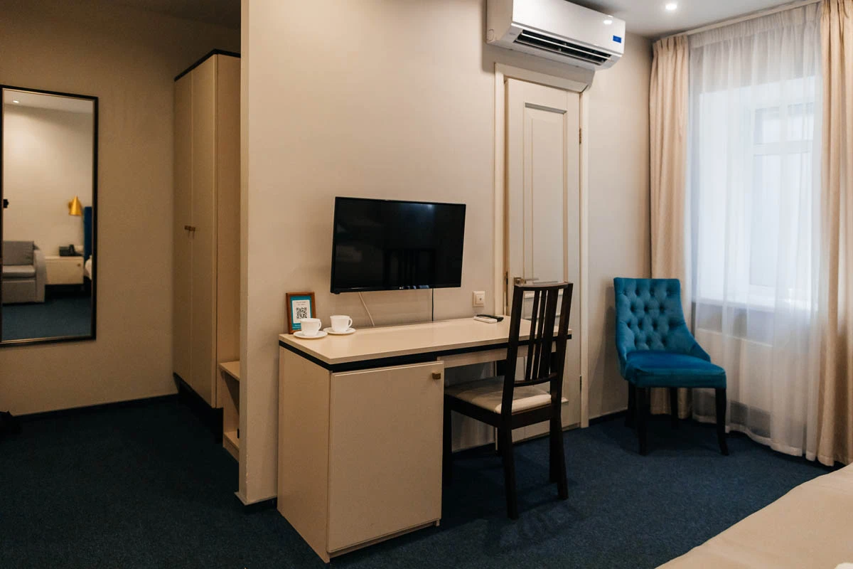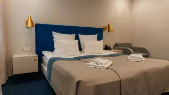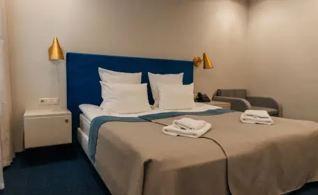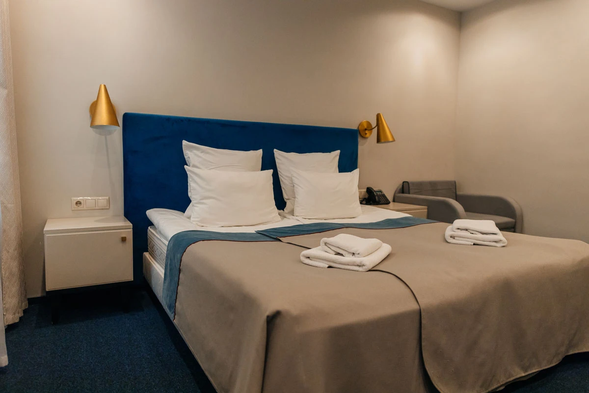 Однокомнатный номер площадью 15 м2 с одной двуспальной или двумя односпальными кроватями. Предполагает одноместное и двухместное размещение. Расположен на цокольном этаже.