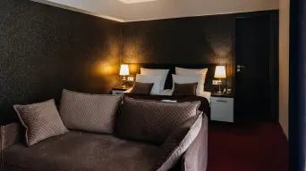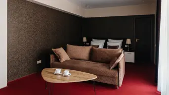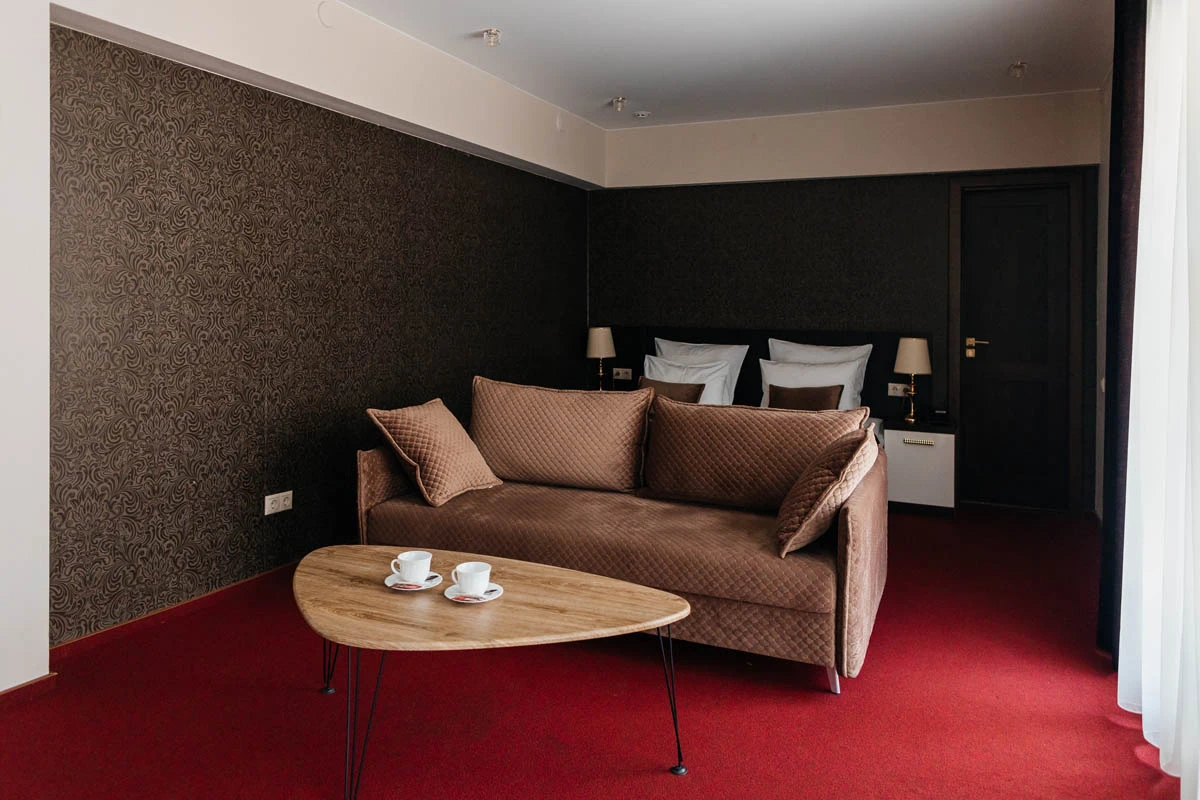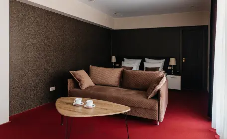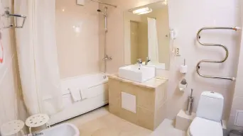 Просторный однокомнатный номер площадью 32 м2 с выделенной рабочей зоной. Предполагает одноместное и двухместное размещение.