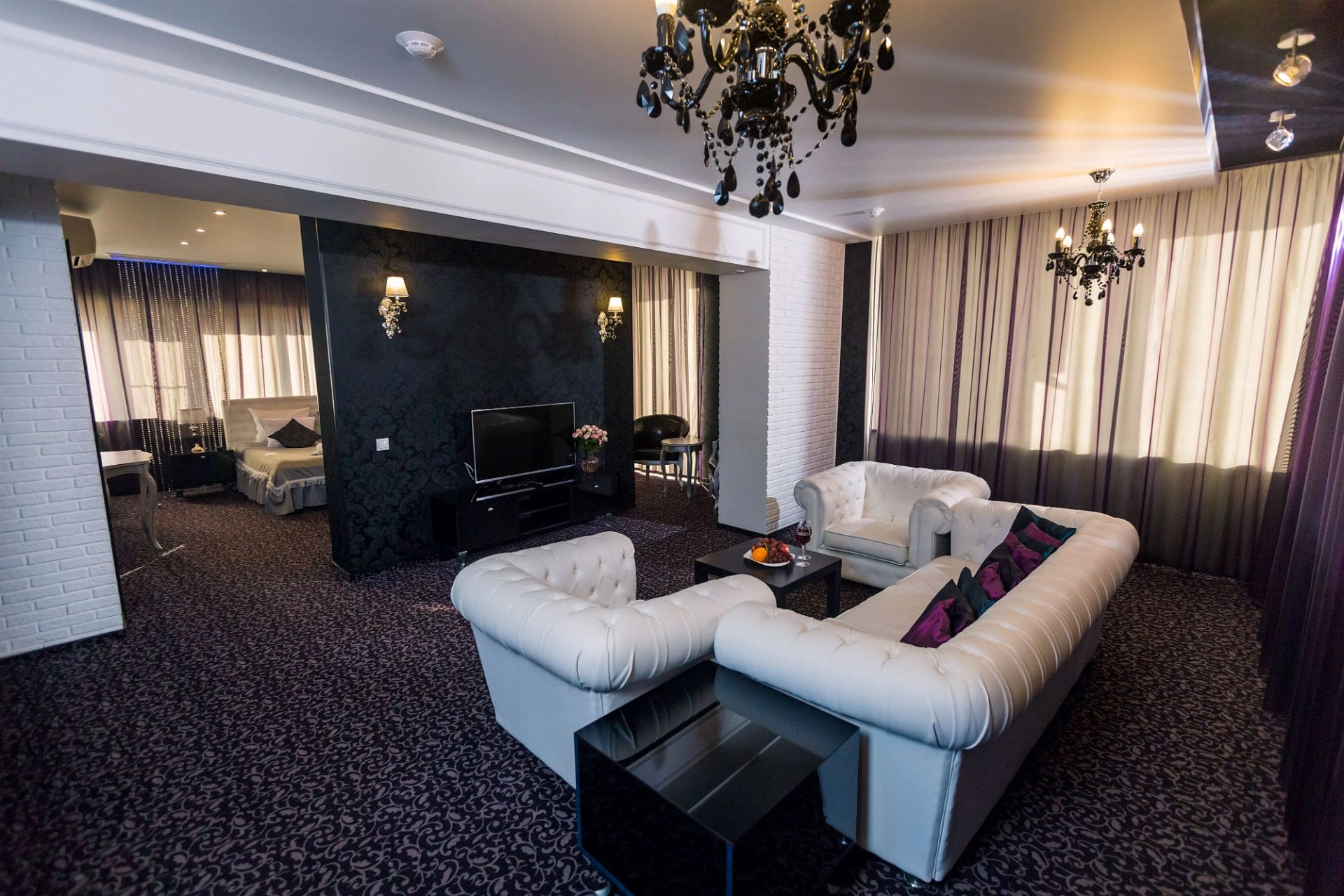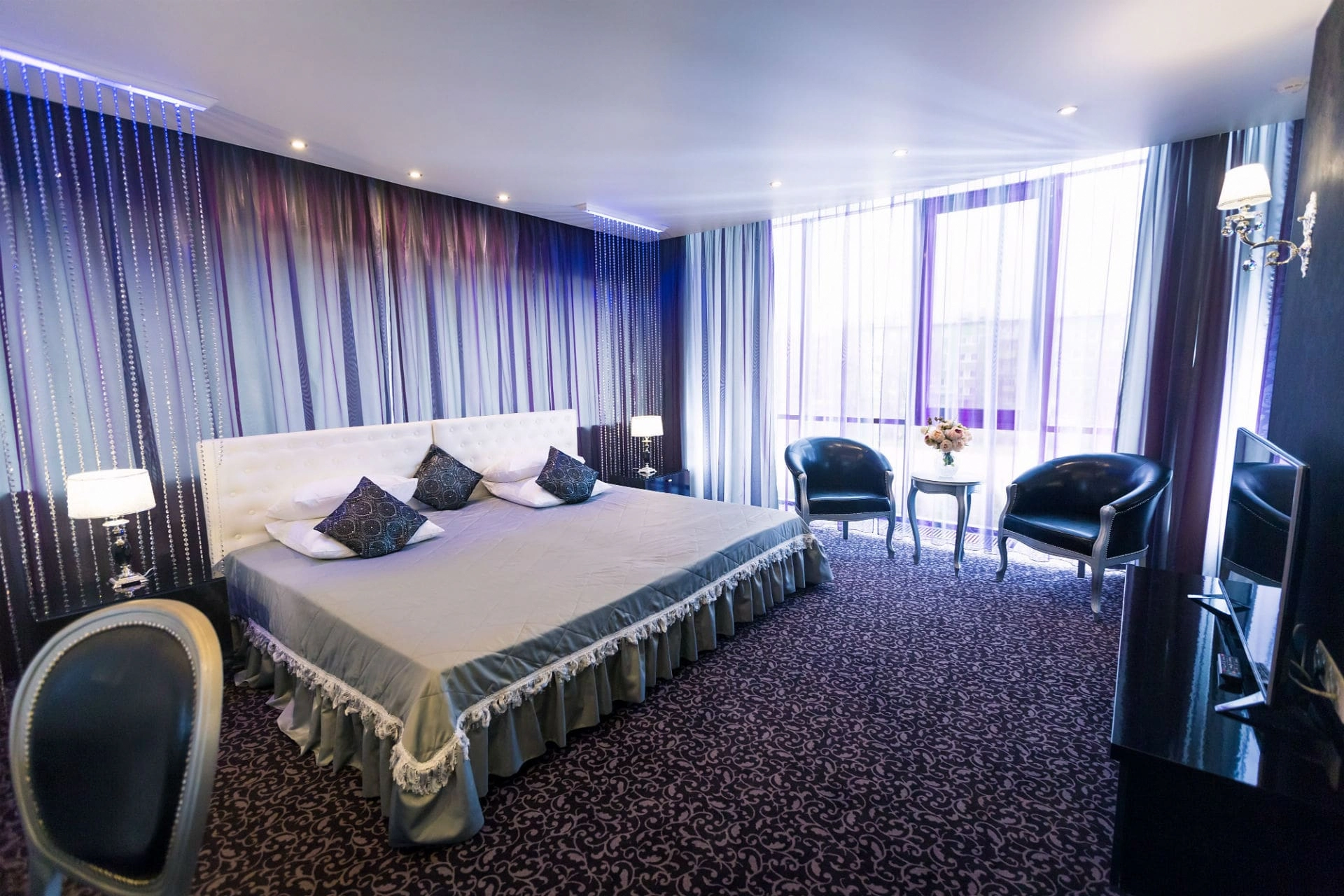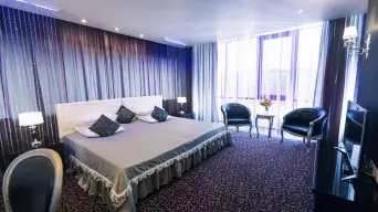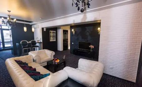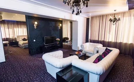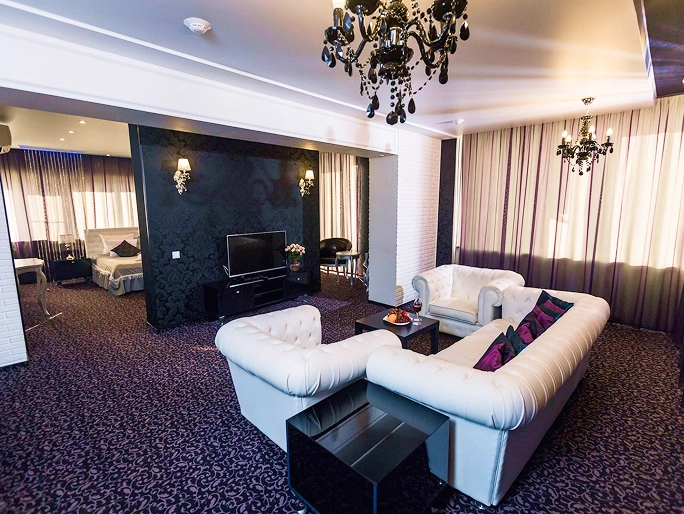 Двухкомнатный номер площадью 72 м2 с современным дизайнерским решением, с большой двуспальной кроватью, с ванной джакузи.