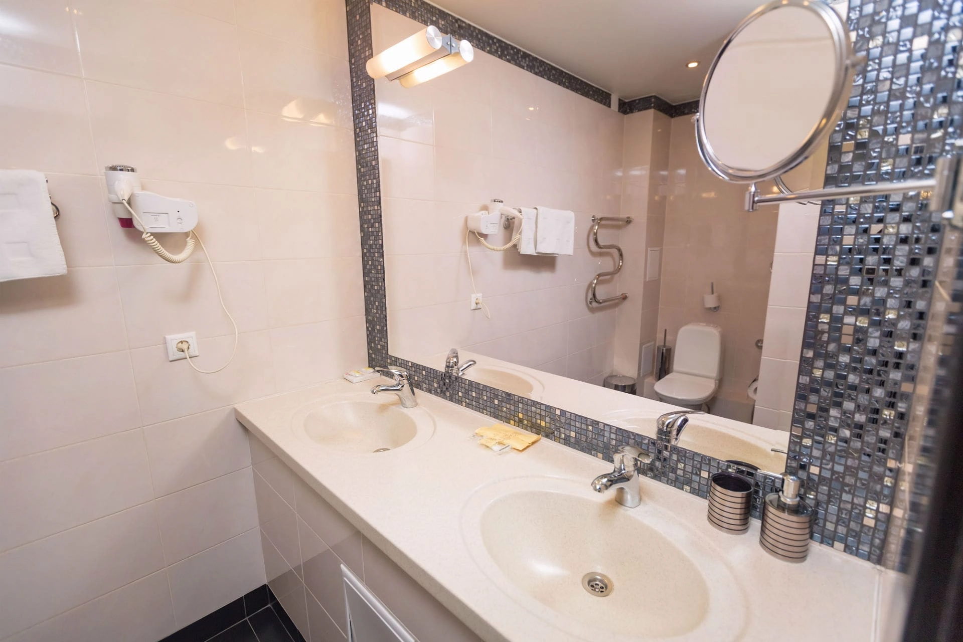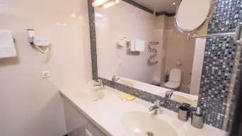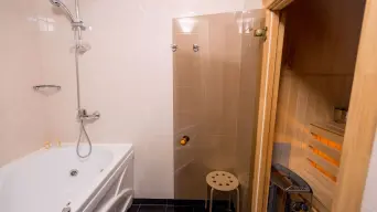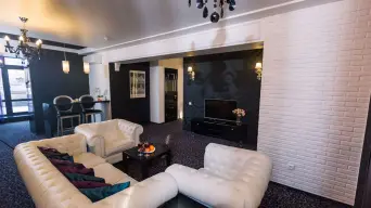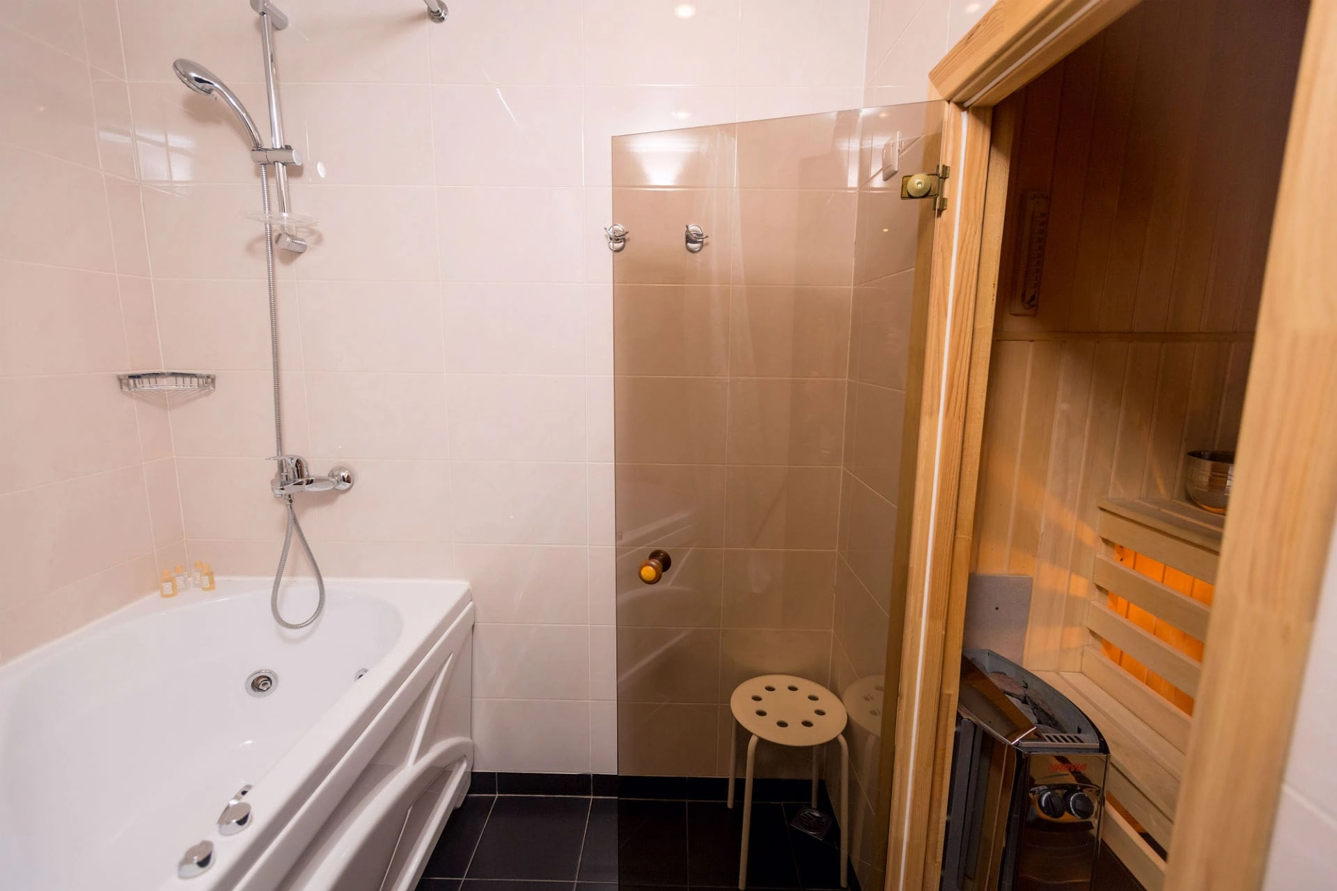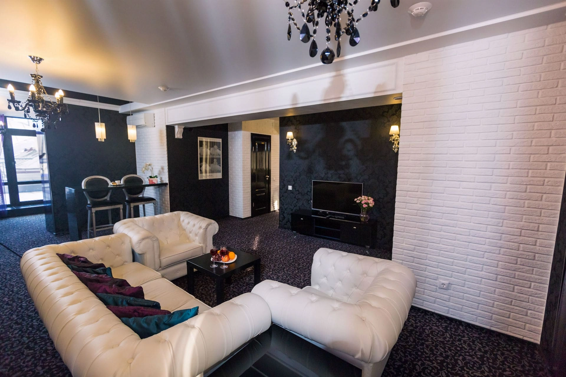 Двухкомнатный номер площадью 72 м2 с современным дизайнерским решением, с большой двуспальной кроватью, с ванной джакузи.