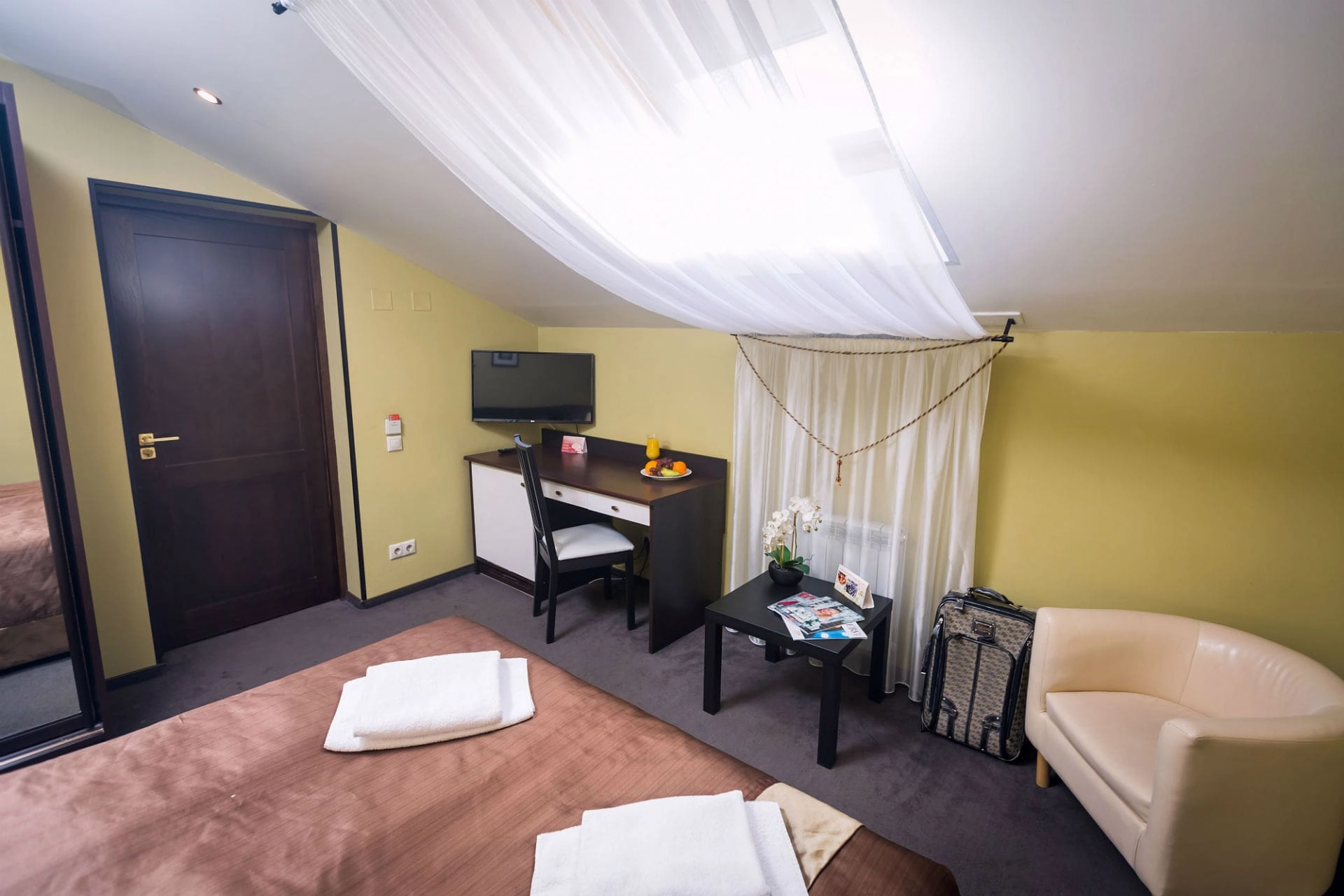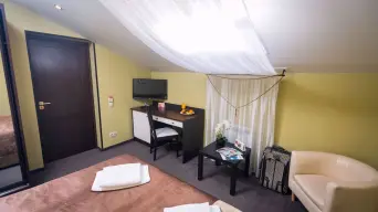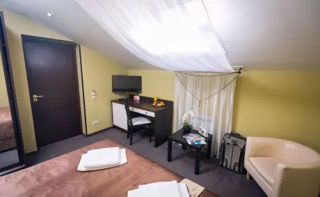 Однокомнатный номер площадью 15 м2 с одной кроватью 160×200. Расположен на мансардном этаже.